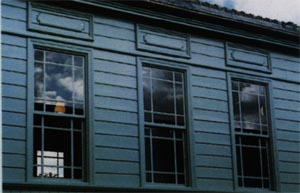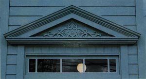 木製サッシュの上げ下げ窓2階窓枠上部に配した長方形のフィールディング・パネル。 |