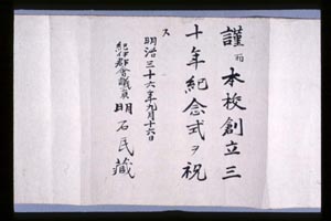 (崇仁小学校蔵) 1903年(明治36) 1903年(明治36)、紀伊郡柳原町尋常小学校創立30周年記念式典の祝文で、明石民蔵の直筆である。 明治の町村にとって、小学校の経営は最も重要なものであった。柳原小学校は柳原町を学区域として1873年(明治6)に設立されたが、鴨川対岸に一部いた被差別部落外の人々は、この学校に通うことはなかった。 |