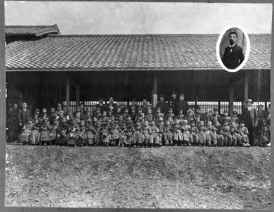 11.柳原小学校入学式記念写真(崇仁小学校蔵) 1911年(明治44) 1911年(明治44)の柳原小学校入学式の記念写真。 柳原小学校の就学率はふるわず、この頃は40%内外であった。このため1900年(明治33)には夜学会を設けて、昼間働く児童を教えた。 右端の円の人が明石民蔵で、この頃、町の学務委員を務めていた。髭を生やした肖像は、この写真1枚である。 |
