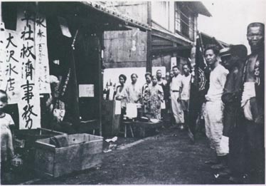 これは昭和10年6月の高瀬川・鴨川の大洪水の際、東七条水平社が設置した水害救済事務所の写真である。 鴨川にかわって恒常的な水運を可能とするために、高瀬川はいくつもの水量調節機能を設け高度に管理された運河だった。しかし明治以降、流路変更や川幅の減少、重要な遊水池としての機能を持った内浜の埋め立てなどが重なり、運河としての役目を終えた後はさらに管理水路としての機能を低下させていった。ここに未曾有の集中豪雨が悲劇を引き起こすこととなった。 特に東七条(現在崇仁)の被害は大きく、その被災者救済の不公平をめぐって水平社東七条支部は「不公平分配反対同盟」を結成し水害闘争を展開した。 |